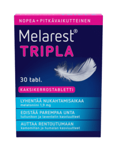 Melarest Tripla erottuu kolmitehoisella vaikutuksellaan: se auttaa nukahtamaan nopeammin, parantaa unen laatua ja tukee virkeämpää aamua. Tuotteessa oleva B6-vitamiini tukee hermoston normaalia toimintaa ja auttaa kehoa hyödyntämään melatoniinia tehokkaammin. Se sopii erityisesti stressaaville kausille, jolloin sekä mieli että keho kaipaavat tukea palautumiseen.